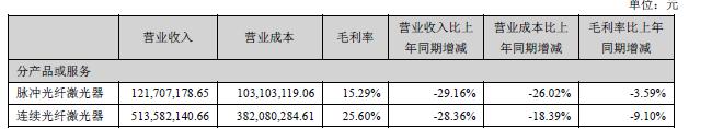 报告期内,公司中高功率连续光纤激光器系列产品的市场应用逐渐向激光熔覆、激光清洗以及新能源焊接等领域拓展。随着公司万瓦级大功率连续光纤激光器产品市场份额的增加,中高功率连续光纤激光器产品主导地位进一步提升。目前,公司连续光纤激光器产品的销售收入已达到产品销售收入的72.40%。